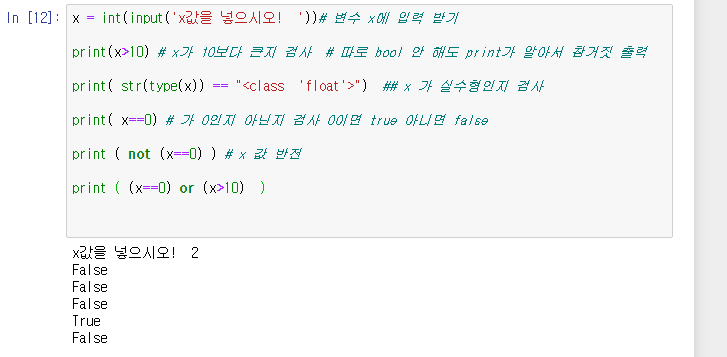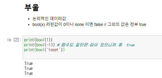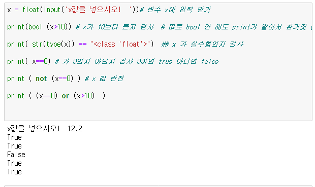 - 논리형식 데이터 참과 거짓 // bool(x) 함수를 통해 return 값이 true or false