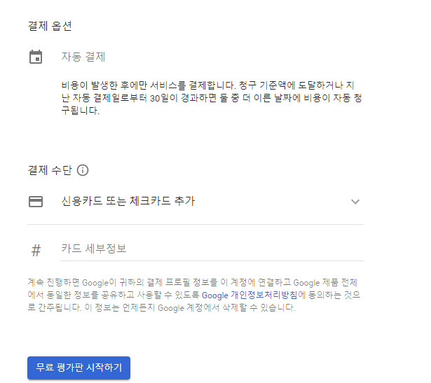 결제 정보를 입력하고 무료 평가판 시작을 누르면