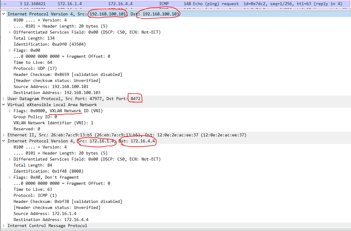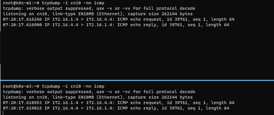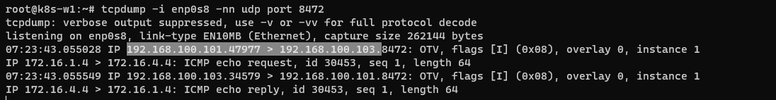 - vxlan이 감싼 정보는 파드들의 정보 ip 172.16 대역임을 확인