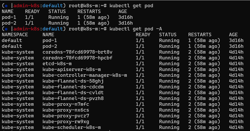 - 보통 kubectl get pod 하면 뒤에 네임스페이스 default가 생략되어 있음