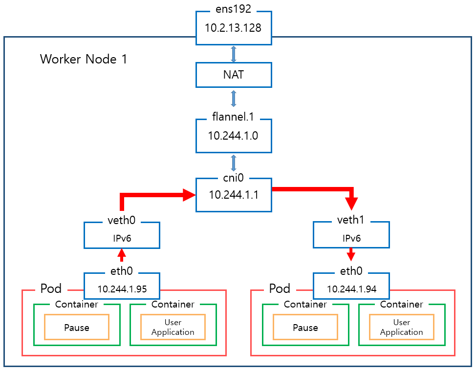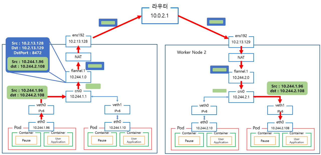 - 파드의 veth0 -> cni0 (브릿지) -> flannel.1 -> nat -> 외부