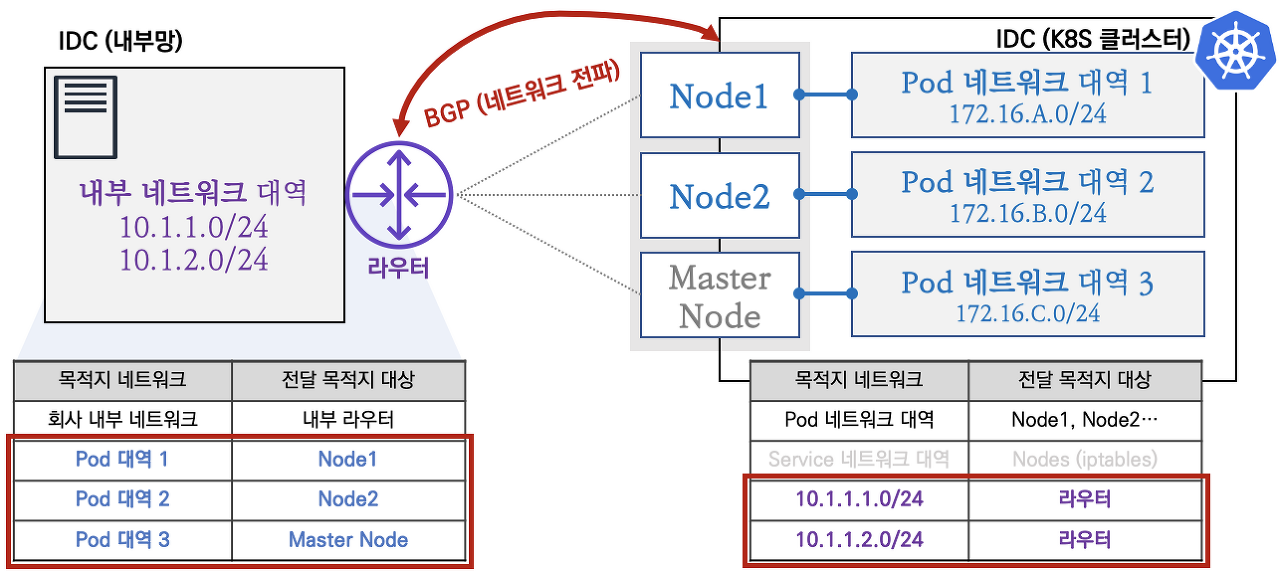 - K8S 클러스터 내부 네트워크와 idc 온프레미스 네트워크 대역간 BGP를 통해서 통신