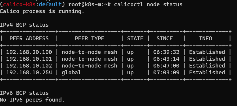 cat <<EOF | calicoctl apply -f - apiVersion: projectcalico.org/v3 kind: BGPPeer metadata: name: bgppeer-rtr spec: peerIP: 192.168.10.254 asNumber: 64512 EOF