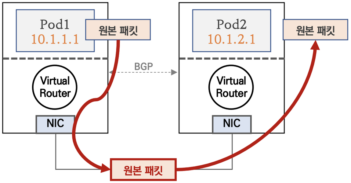 - 파드 패킷이 노드 라우팅 정보를 보고 바로 목적지 노드로 원본 패킷 그대로 전달