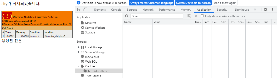 - 쿠키가 삭제되고 쿠키가 없으니 $_COOKIE[$cookieName] 호출 불가라 에러 뜸