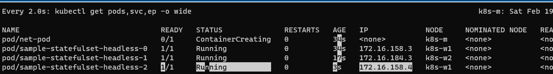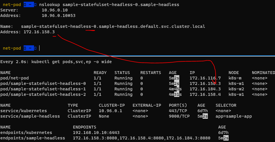 파드 3개 응답 받음 - headless 서비스 명으로 조회시 해당 서비스네임에 묶은 서비스 리스트를 반환