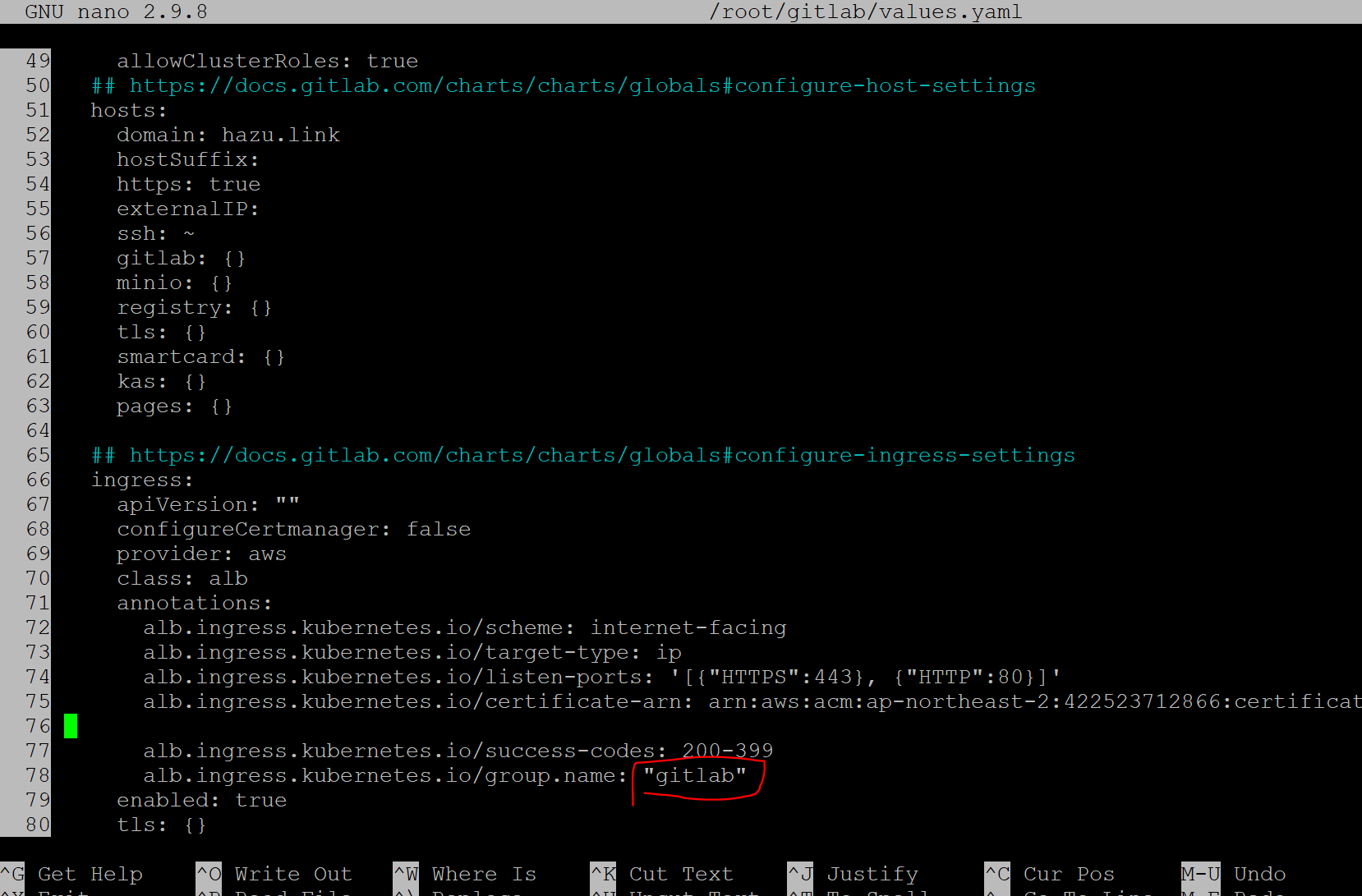 helm의 value.yml파일 수정 중 깃랩의 경우 설치시 alb 4개를 설치하게 되는데