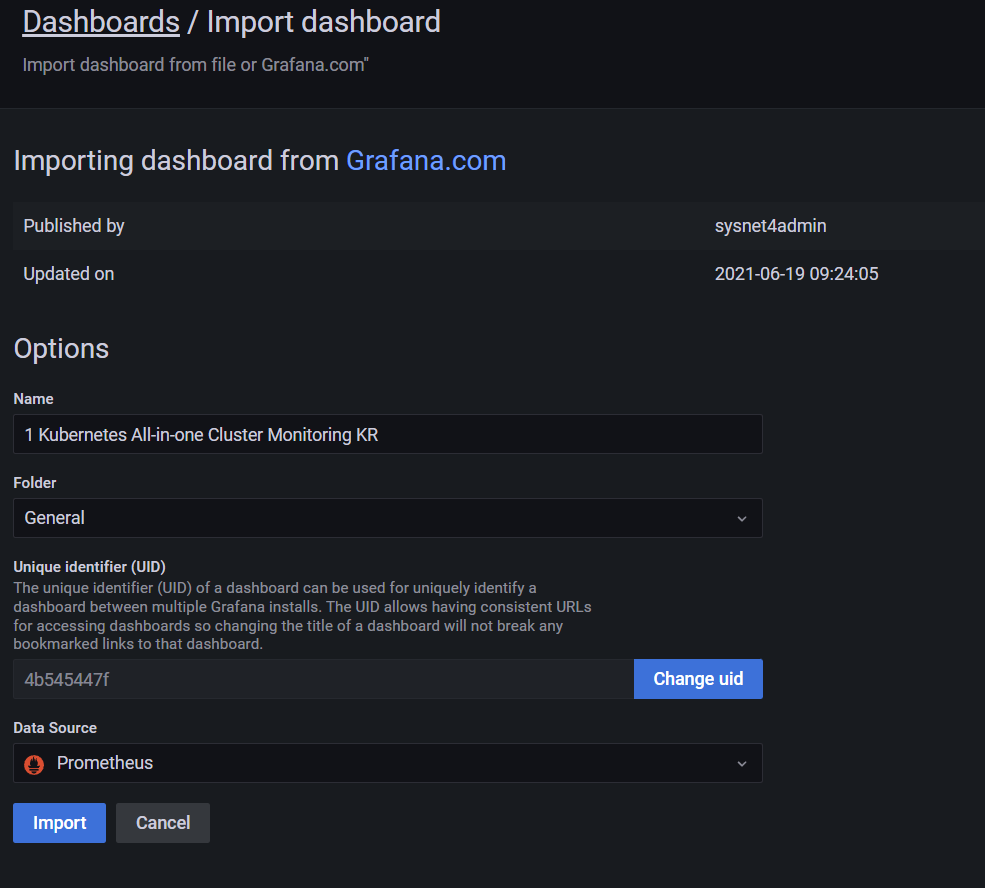 그라파나 -> 대쉬보드 > import dashboard 선택