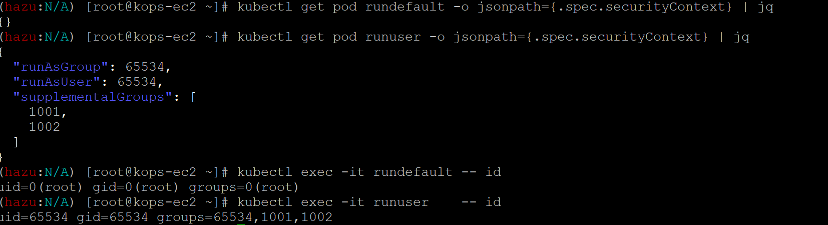 kubectl get pod rundefault -o jsonpath={.spec.securityContext} | jq