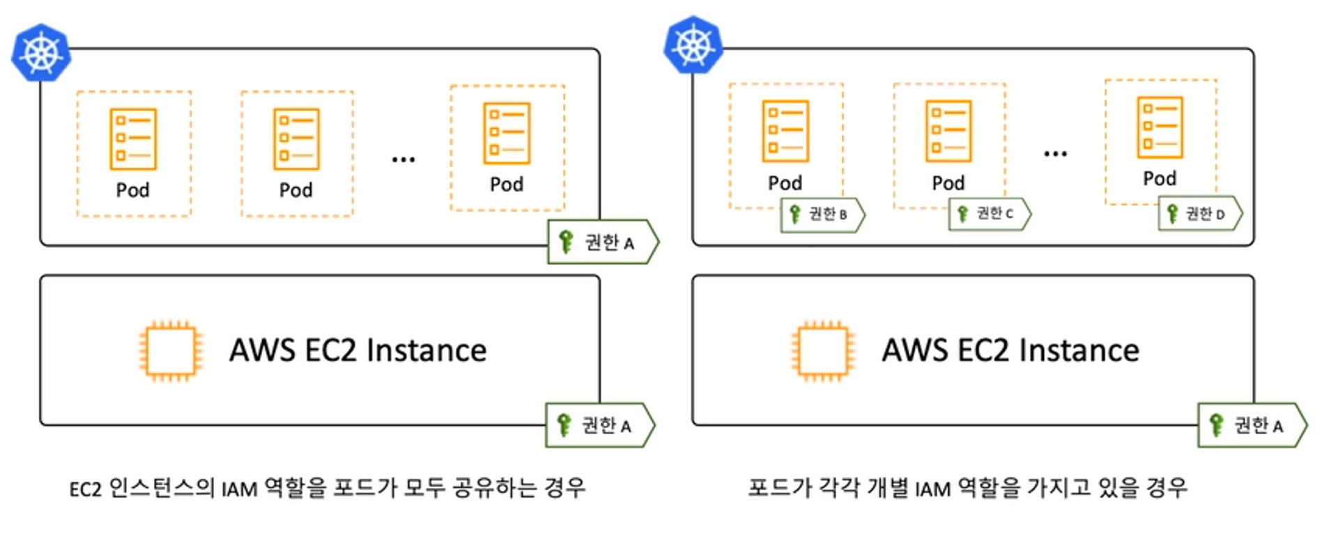 iam 역할을 공유하는 경우 pod 하나만 탈취되더라도 공유되기때문에 문제